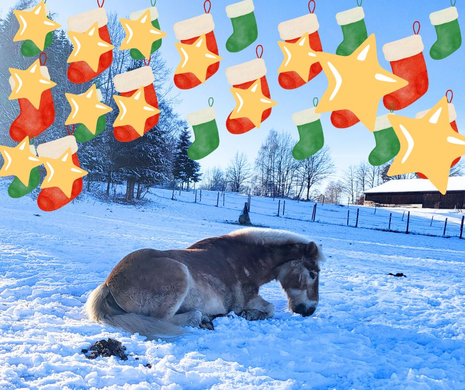 schnee liegt auf der koppel und mittendrin liegt winnie und träumt von futter.